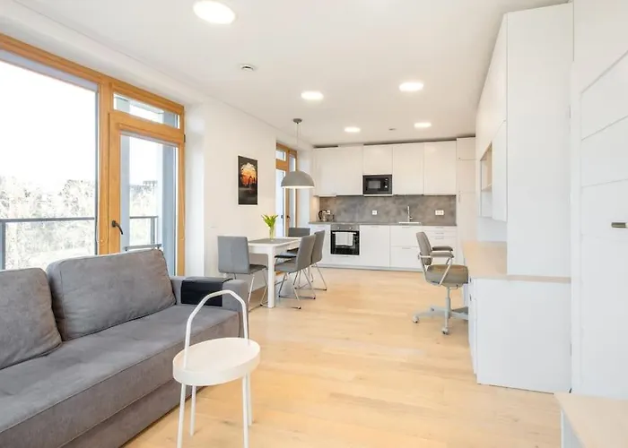 Apartment With Balcony And Castle View By Urban Rent Vilnius, som har en terrass, ligger inom 5 minuters promenad från Nationalmuseet Litauen. Den 47 m² stora lägenheten erbjuder moderna faciliteter som WiFi, samt en parkering för bilresenärer.